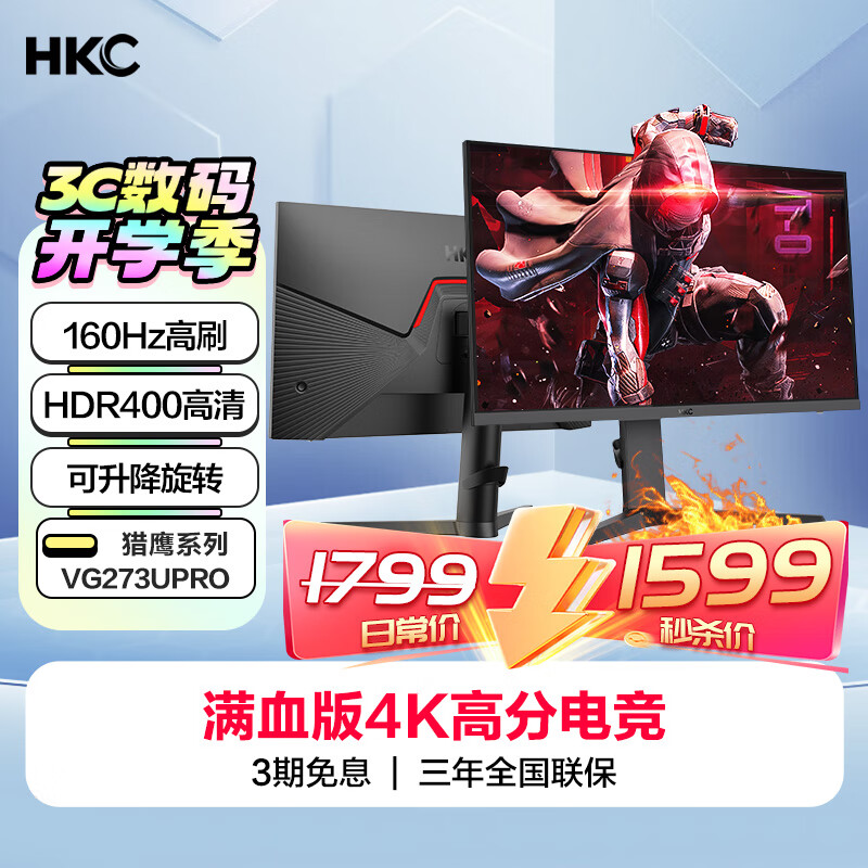 HKC 27英寸FastIPS屏4K160Hz HDR400广色域10Bit 1ms升降旋转电竞游戏144Hz电脑显示器 猎鹰VG273Upro价格:1999.00元!
