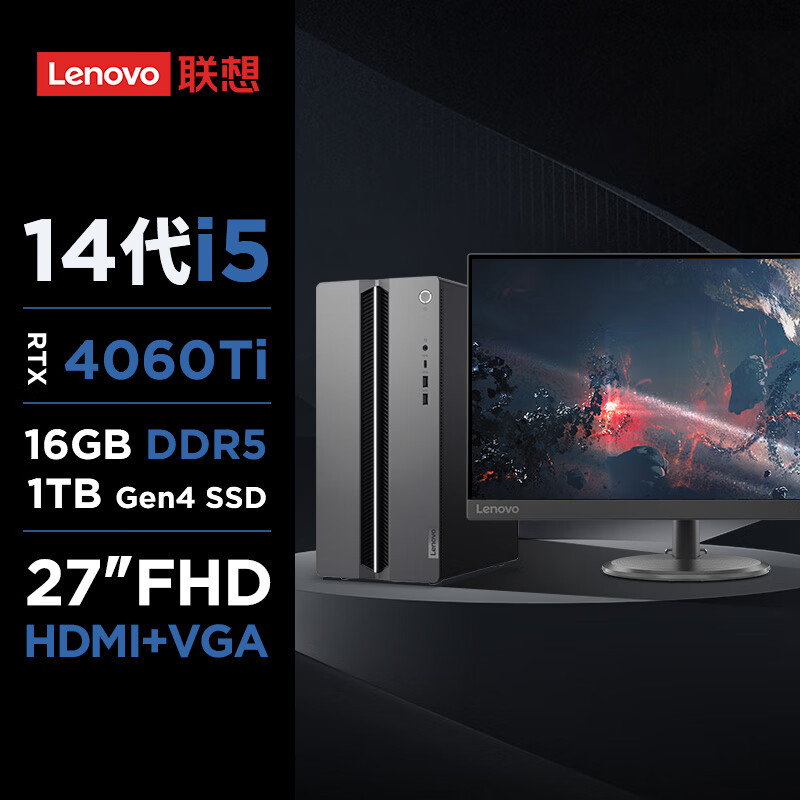 联想(Lenovo)GeekPro设计师游戏台式电脑主机(酷睿14代i5-14400F RTX4060Ti 8GB显卡 16G DDR5 )27英寸显示器价格:7499.00元!