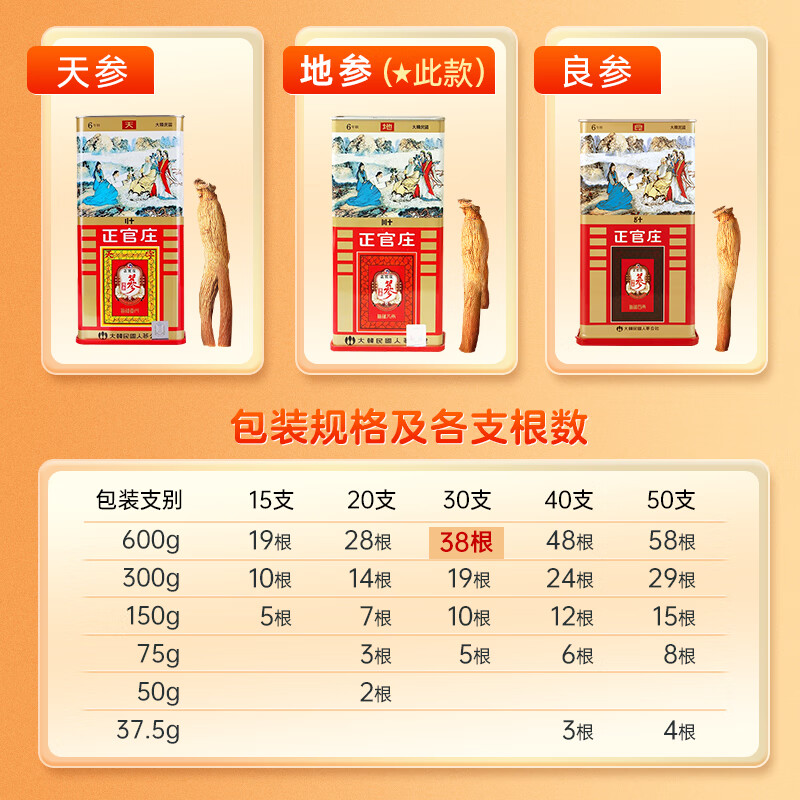 正官庄 人参 韩国原装进口 六年根高丽参 红参 [地字]30支600g(约38根参)含丰富皂苷 中秋送礼礼盒礼品价格:10800.00元!