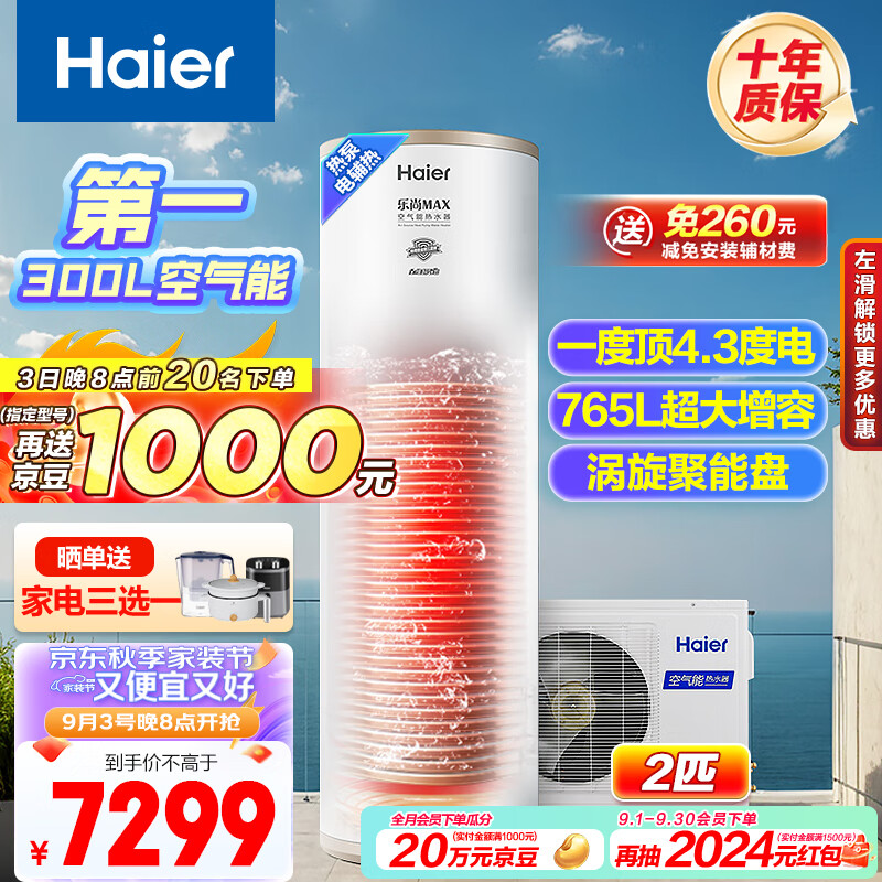 海尔(Haier)空气能热水器300升超一级2匹南北通用电辅80℃净水洗京东小家以旧换新RE-300N5U1(6-10人)价格:7299.00元!