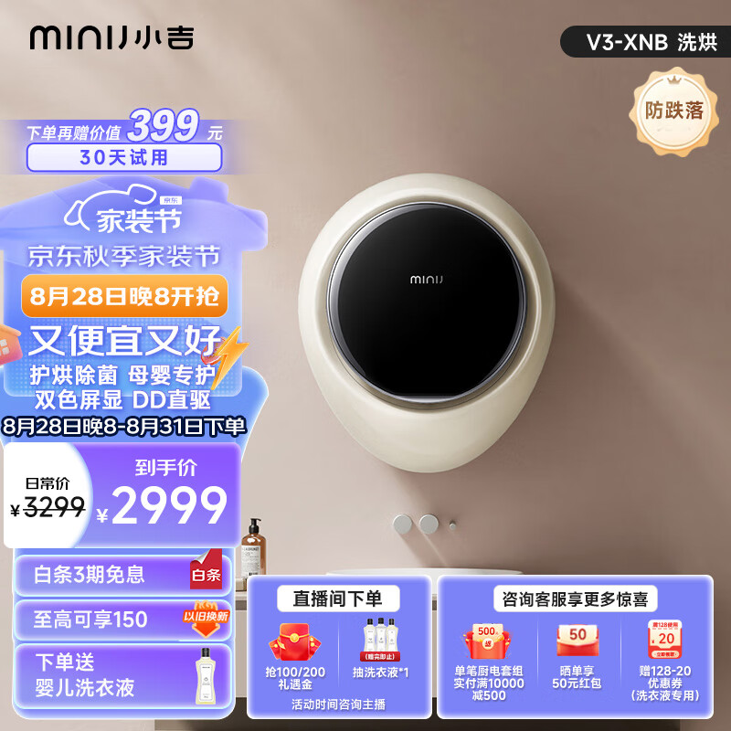 小吉(MINIJ)壁挂洗衣机 婴儿宝宝儿童全自动智能滚筒 壁挂式洗衣机迷你变频洗烘一体V3-XNB价格:2999.00元!
