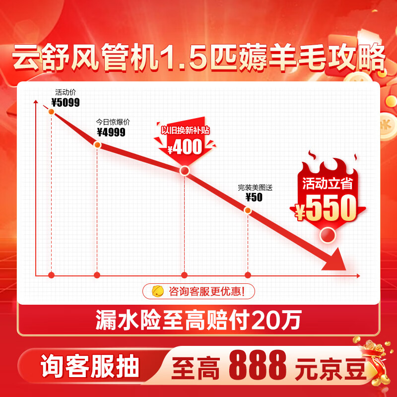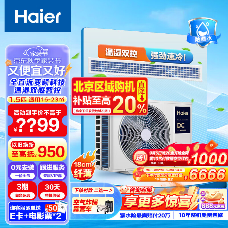 海尔(Haier)中央空调 风管机一拖一 云舒 1.5匹嵌入式空调 变频1级 卧室 KFRd-35NW/70EAD81 一价全包 京配价格:4999.00元!