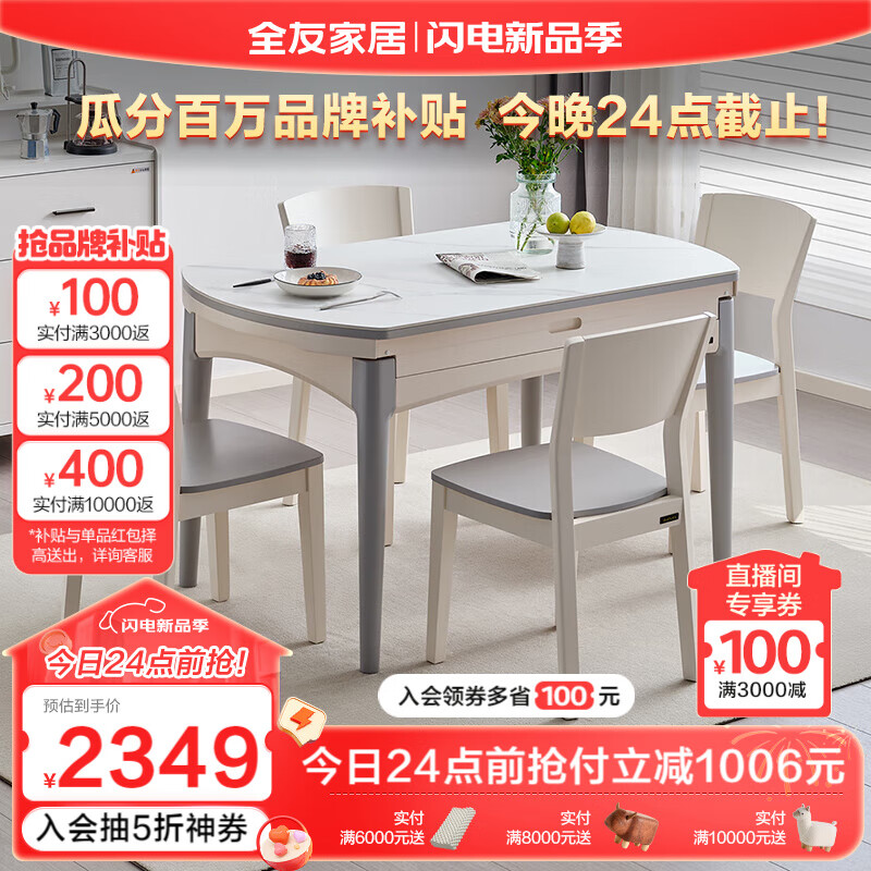 全友家居 现代简约餐桌椅组合家用吃饭桌子可伸缩折叠岩板餐桌DW1028价格:3355.71元!