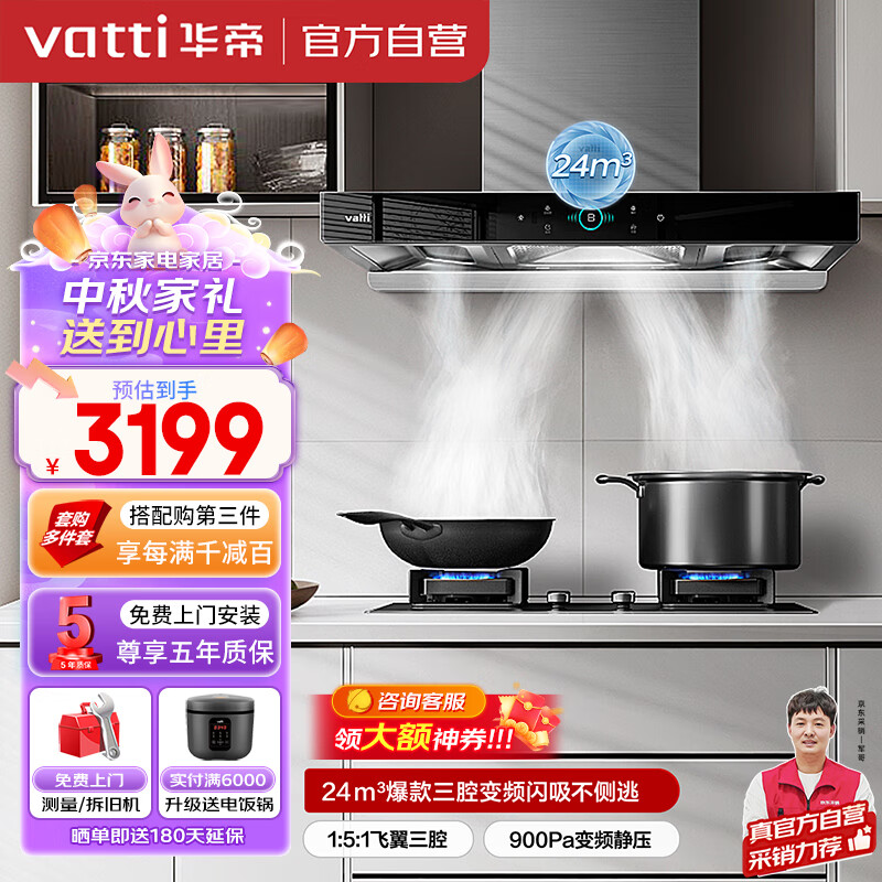 华帝(VATTI)抽油烟机家用顶吸欧式变频大吸力24风量自动清洗脱排吸油烟机灶具烟灶套装一级能效i11206天然气价格:3299.00元!