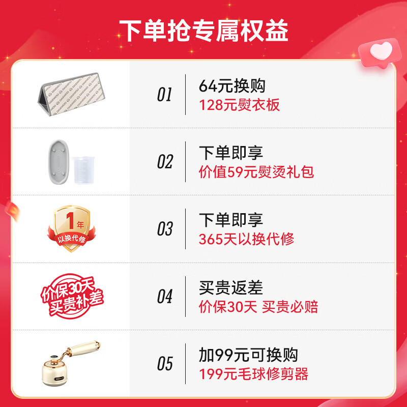 特色功能:快速蒸汽,增压蒸汽,高温除菌,超大蒸汽,小巧便携,水箱清洁,水箱除垢,自动断电