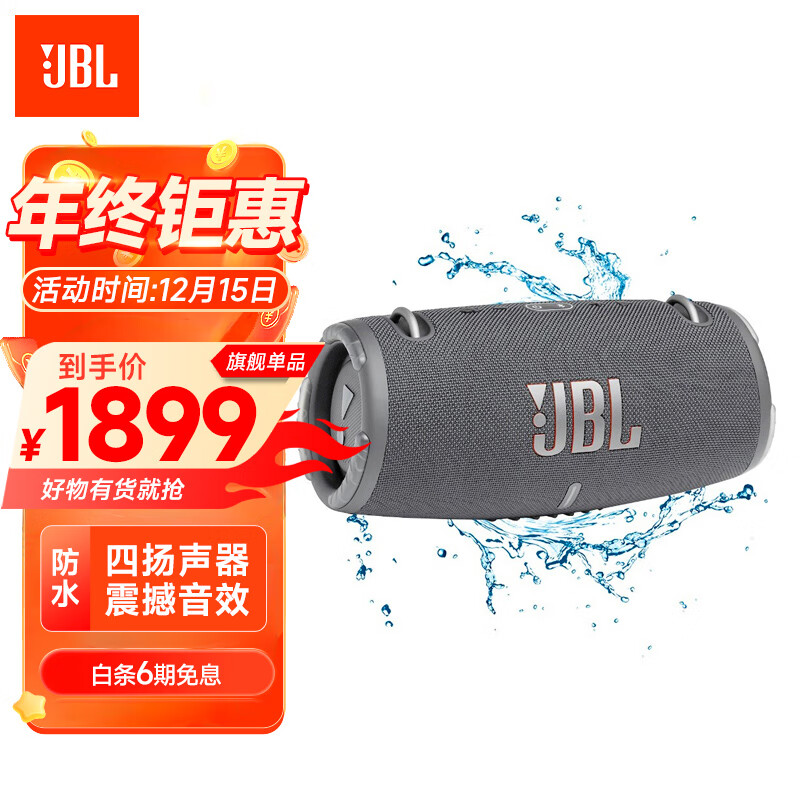JBL XTREME3 音乐战鼓三代 便携蓝牙音箱 户外音箱 电脑音响 低音炮 四扬声器系统 防尘防水 灰色价格:2499.00元!