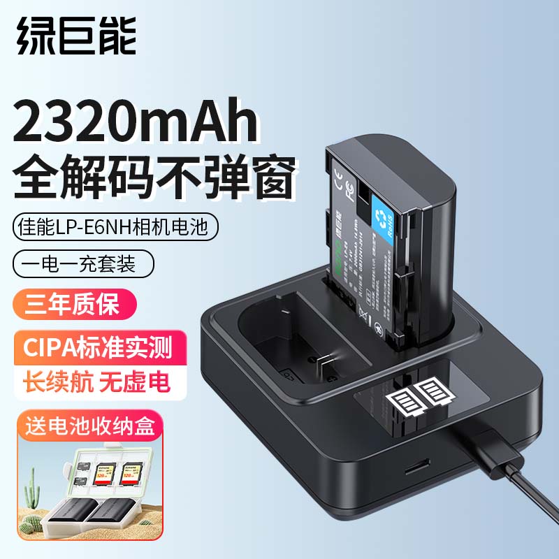 绿巨能(llano)佳能电池LP-E6NH相机电池充电器套装适用60D 5d4 5D3 6D 90D 80D 70D 6D2单反数码相机一电双充价格:219.00元!