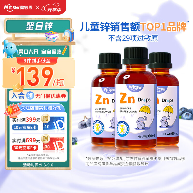 witsbb健敏思锌滴剂宝宝锌剂儿童锌复合螯合锌滴剂60ml*3瓶装 葡萄口味 美国原装进口价格:525.00元!