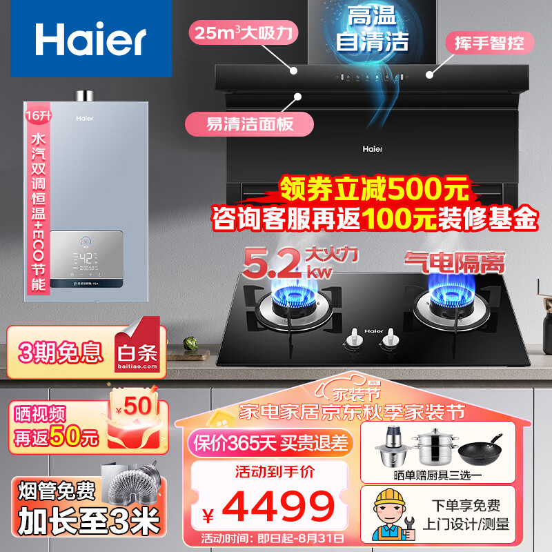 海尔(Haier)抽油烟机燃气灶套装25立方顶侧底三吸自清洁EC725+5.2KW灶Q2BE50+16升下置风机热水器三件套[家电]价格:5099.00元!