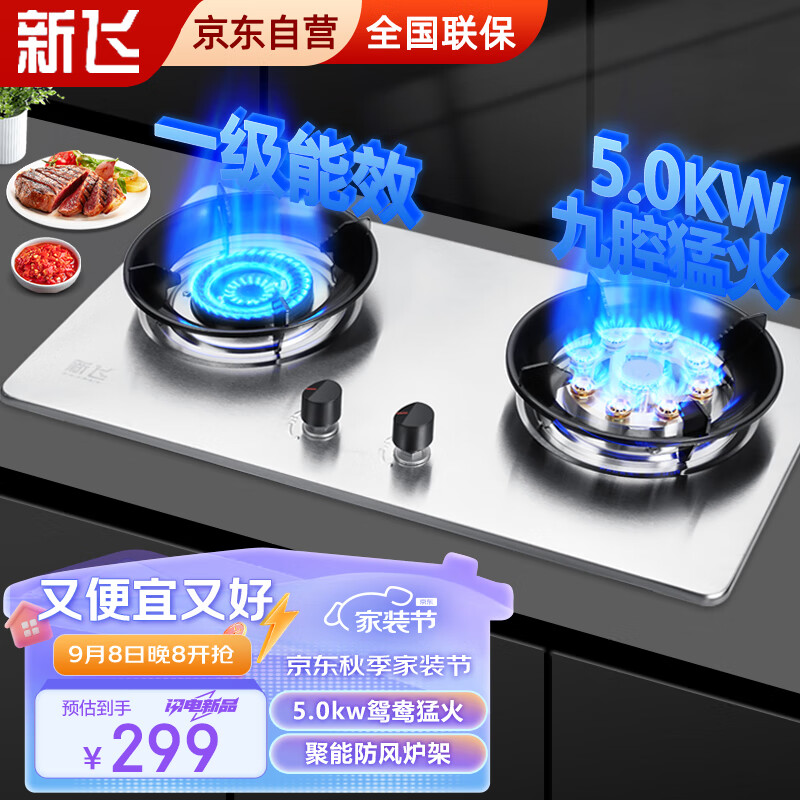 新飞家用燃气灶液化气双灶不锈钢5.0KW一级能效嵌入式台式灶煤气灶聚能猛火纯铜鸳鸯炉具JZY-A2价格:299.00元!