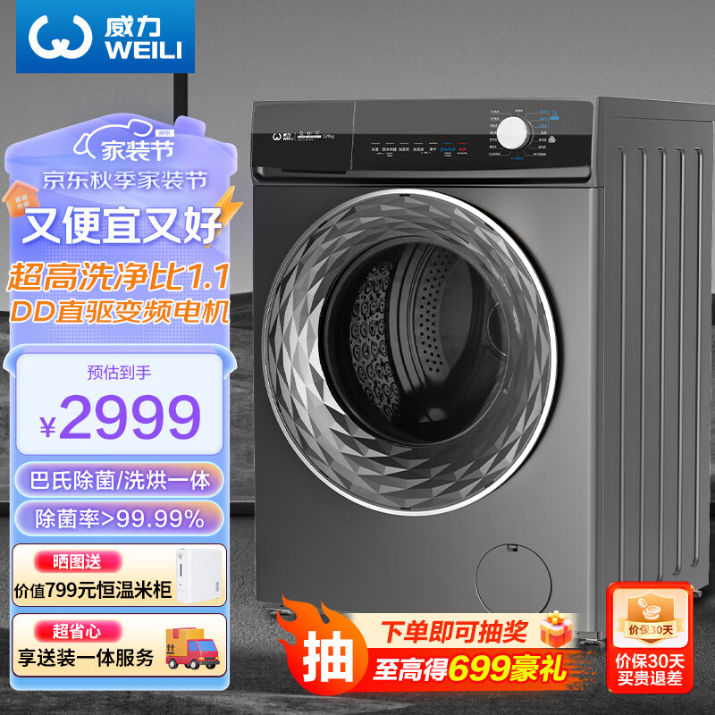 威力(WEILI)12公斤大容量DD直驱变频 洗烘一体滚筒洗衣机 3D蒸汽洗 超大触控屏 96℃高温洗 XQG120-1439DDH价格:2999.00元!