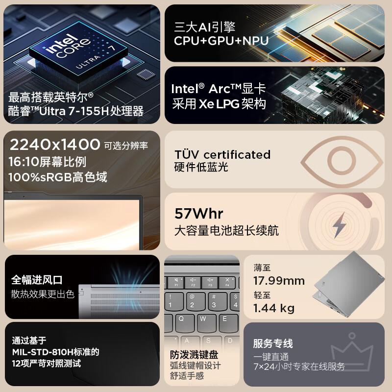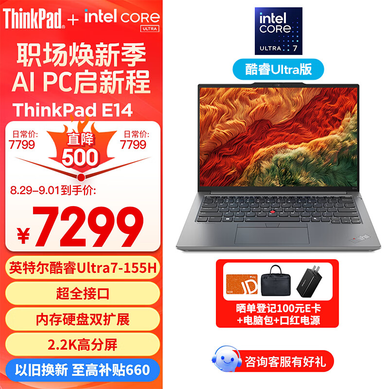 ThinkPad 联想E14笔记本电脑 AI PC 2024 14英寸商务办公学生轻薄本 全新酷睿Ultra7 155H 32G 1T 2.2K银色价格:7299.00元!