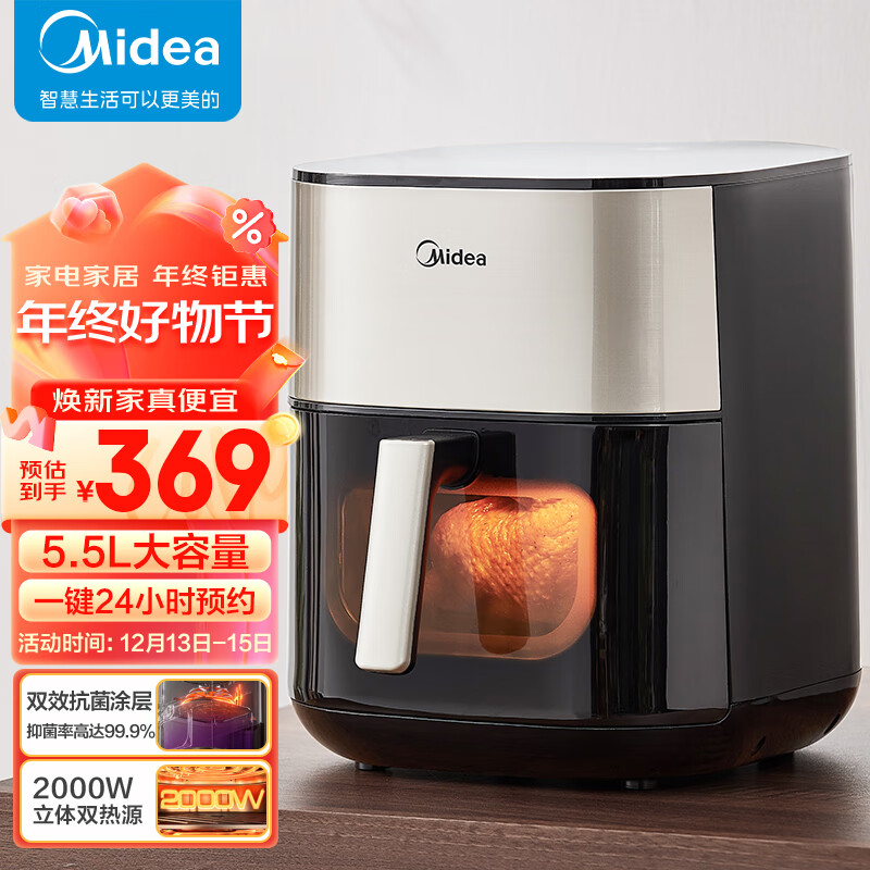 美的(Midea)小炎烤空气炸锅 双热源免翻面 可视 家用大容量 5.5L 炸烤箱一体 多功能 不沾易洗 KZC5504价格:369.00元!