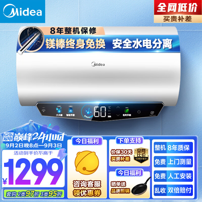 美的(Midea)终身免换镁棒80升电热水器3300W大水量一级能效节能自动杀菌水电分离以旧换新F8033-JE5(HE)价格:1499.00元!