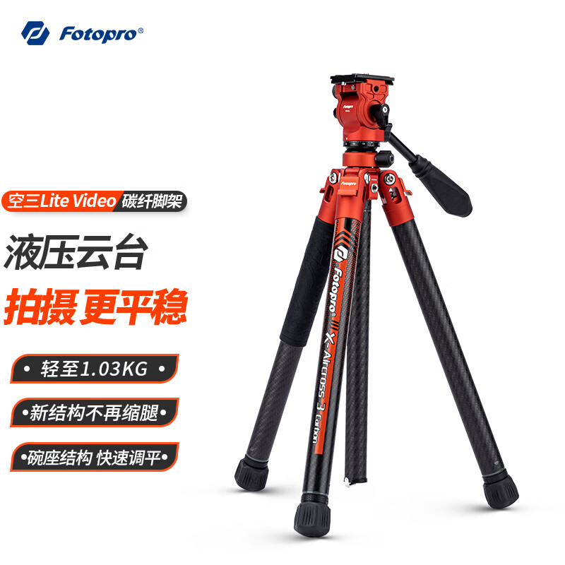 富图宝(Fotopro)空气三号lite VIDEO液压云台碳纤维相机微单摄影摄像三脚支架 火焰橙 重/1KG 手机夹价格:849.00元!
