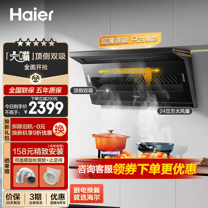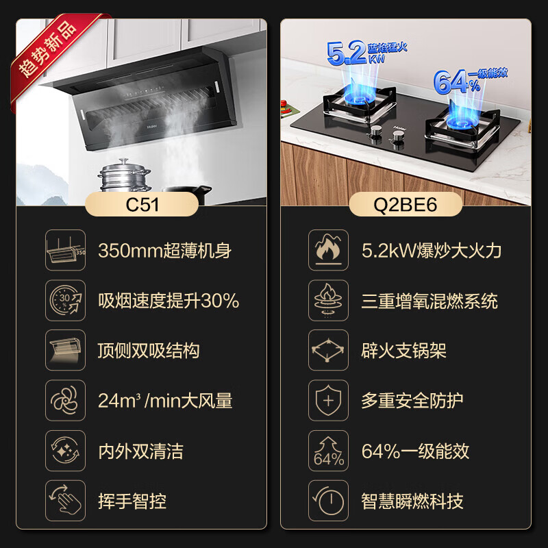 海尔(Haier)抽油烟机 顶侧双吸烟灶套装 24m3/min大吸力 挥手智控 配5.2kw大火力64%高热效灶C51+Q2BE6天价格:2599.00元!