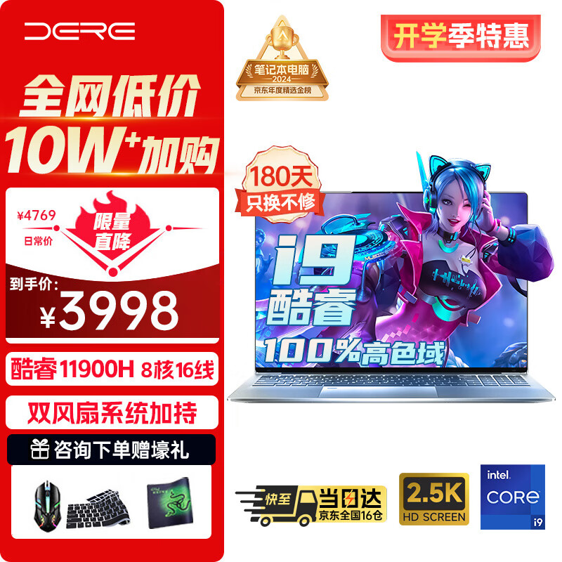 戴睿(dere)超能旗舰16英寸英特尔酷睿i9 笔记本电脑2.5K屏轻薄便携设计商务办公网课游戏本 32G/2TB/魅影灰价格:3998.00元!