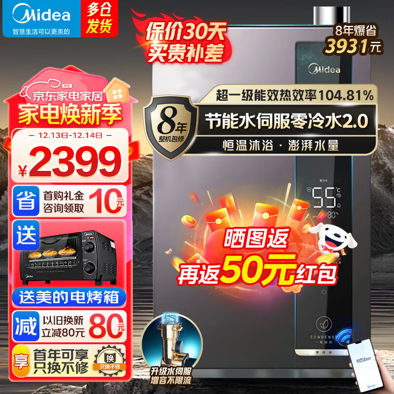 美的(Midea)16升燃气热水器超一级能效智控增压零冷水水伺服恒温天然气家用智能省气节能以旧换新JSLQ27-16LN3价格:2399.00元!