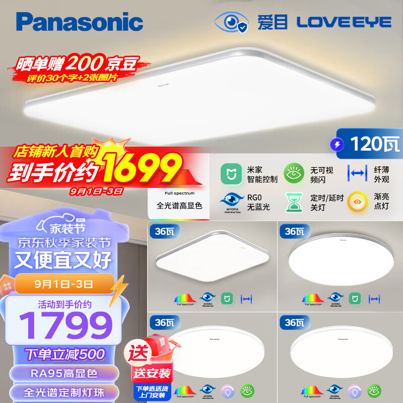 松下(Panasonic)吸顶灯全光谱护眼米家智能客厅灯现代简约灯具松晴四室一厅套装价格:2299.00元!