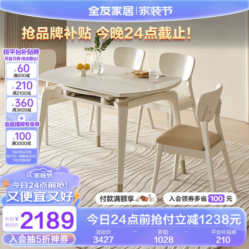 全友家居 餐桌现代简约岩板餐桌可圆可方伸缩功能吃饭桌子家具DW1121B价格:3427.14元!