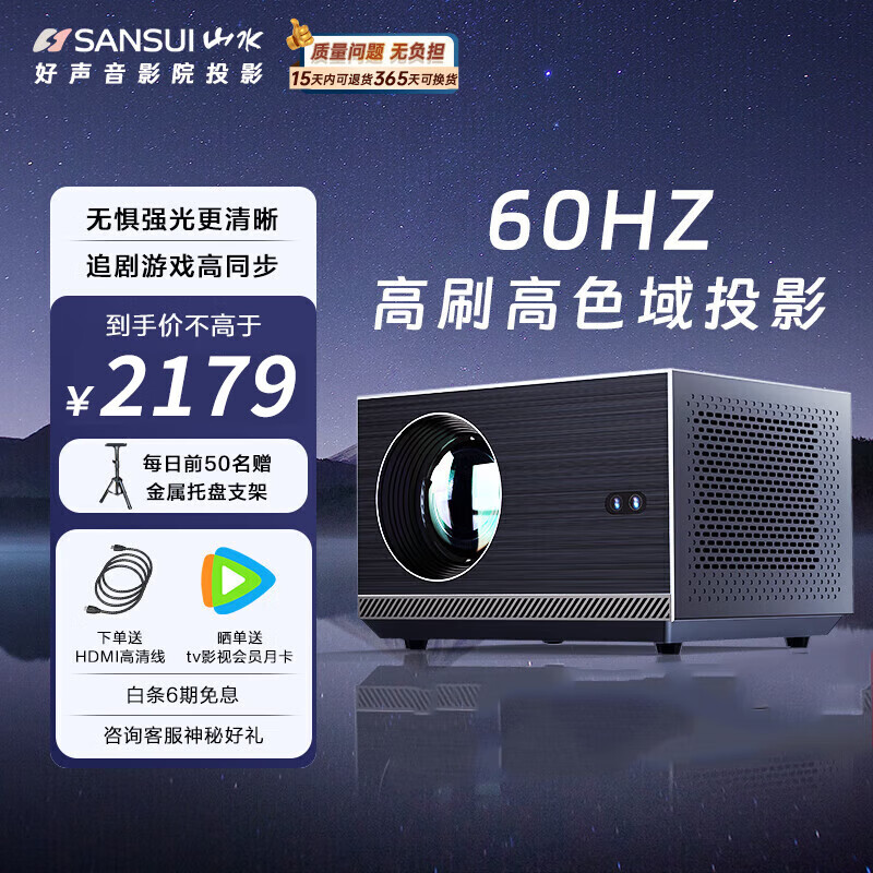 山水S9 60hz投影仪家用家庭影院1080P超高清白天直投 客厅3D影院投影机(自动对焦 2+32G 全封闭光机)价格:2378.50元!