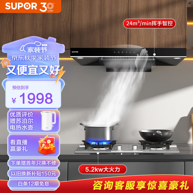 苏泊尔(SUPOR)抽油烟机燃气灶套装 欧式烟灶套装 24立方变频风压挥手智旋干洗吸油烟机DT39+DS35液化气价格:1998.00元!