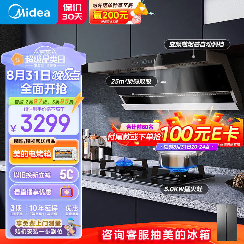 美的(Midea)抽油烟机燃气灶具家用顶侧双吸25风量大吸力变频烟感7字型排烟机新静吸烟灶套装DL7+Q330液化气价格:3299.00元!