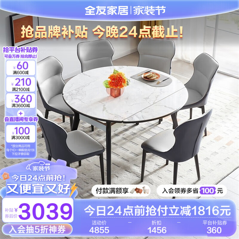 全友家居 现代简约岩板餐桌椅组合吃饭桌子伸缩可折叠家用饭桌DW1059价格:4855.71元!