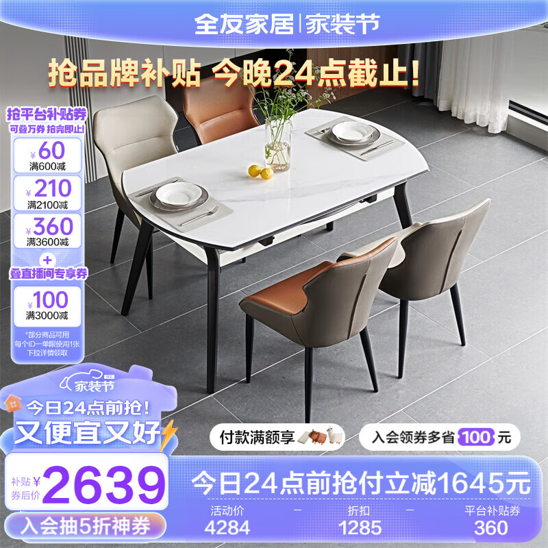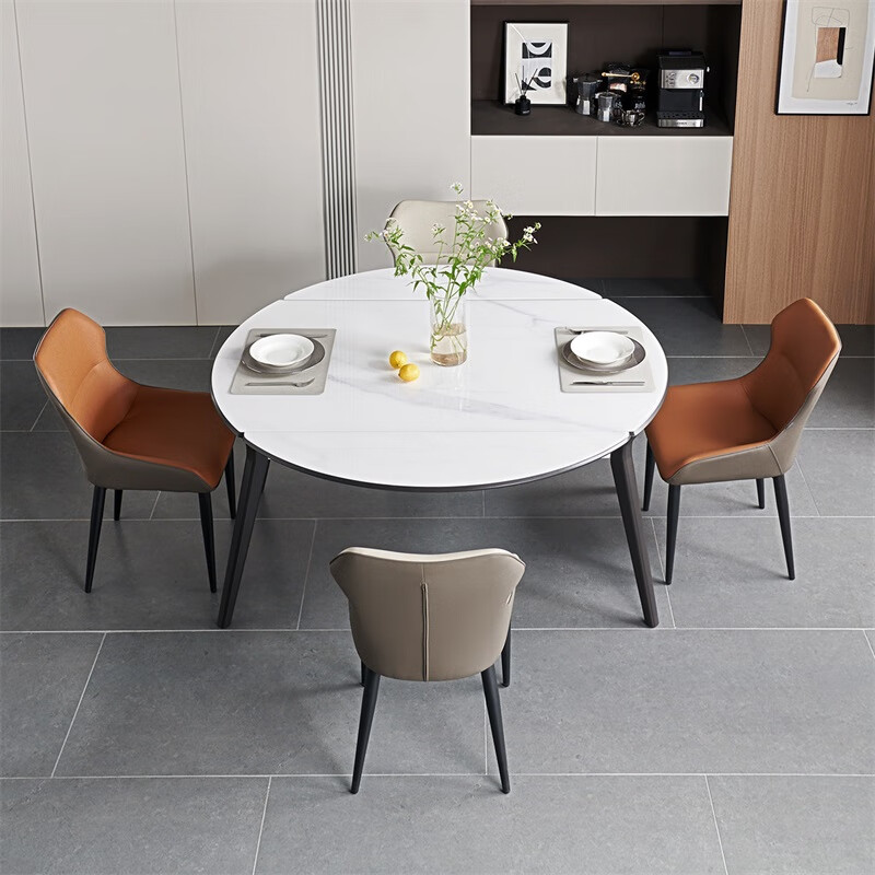 5、在全友上买的桌椅套餐,一个桌子,四把椅子,样子很不错,岩板的用料很扎实。可以收缩的桌面很省空间,展开又可以容纳很多人用餐,很不错