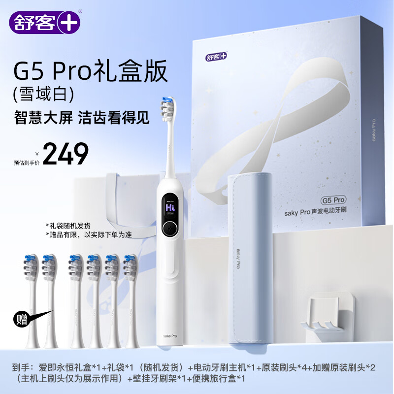 舒客1级清洁情侣电动牙刷智能换区成人/学生送男友/女友软毛护龈 情人节礼物 G5 pro雪域白(礼盒款)价格:299.00元!