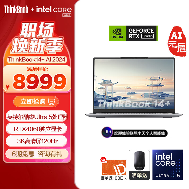 ThinkPad联想ThinkBook 14+ 2024 AI全能本 英特尔酷睿Ultra标压处理器14.5英寸笔记本电脑学生办公轻薄本 Ultra5 32G 1T RTX4060 3K价格:9199.00元!