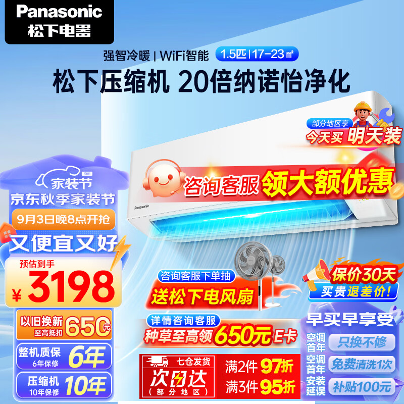 松下(Panasonic)空调滢风1.5匹新三级能效变频冷暖壁挂式空调挂机 20倍纳诺怡除菌 KFR-35GW/BpZY430 以旧换新价格:3298.00元!