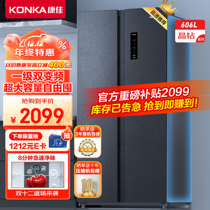 康佳606升双变频一级能效超大容量超薄嵌入式冰箱风冷无霜双循环对开双开门家用电冰箱BCD-606WEGQ5SP价格:2099.00元!