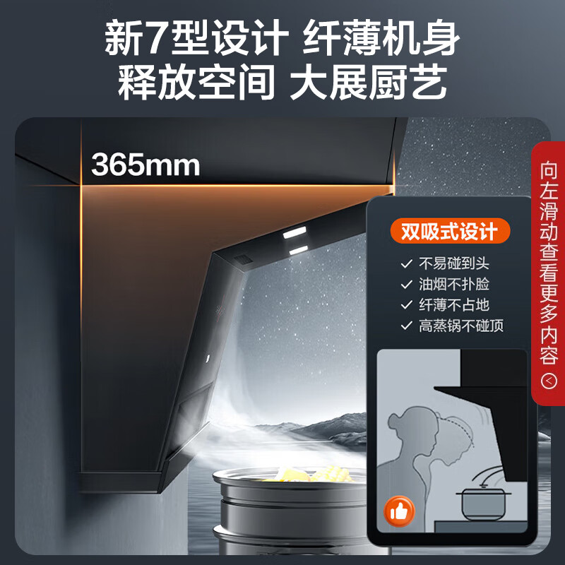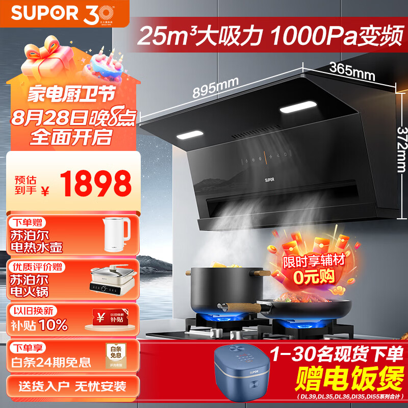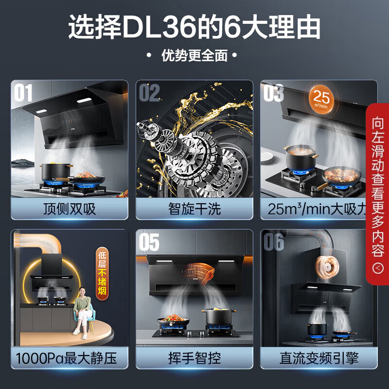 苏泊尔(SUPOR)抽油烟机 顶侧双吸油烟机 25立方大吸力 1000Pa变频 家用挥手免拆洗油烟机DL36价格:1998.00元!