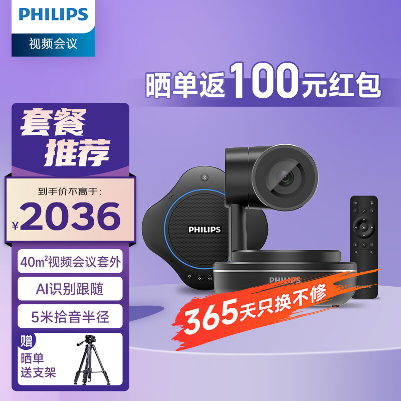 飞利浦视频会议套装/适用40㎡会议室/5米拾音半径全向麦克风0500+2K高清视频会议电脑摄像头0560价格:2036.00元!