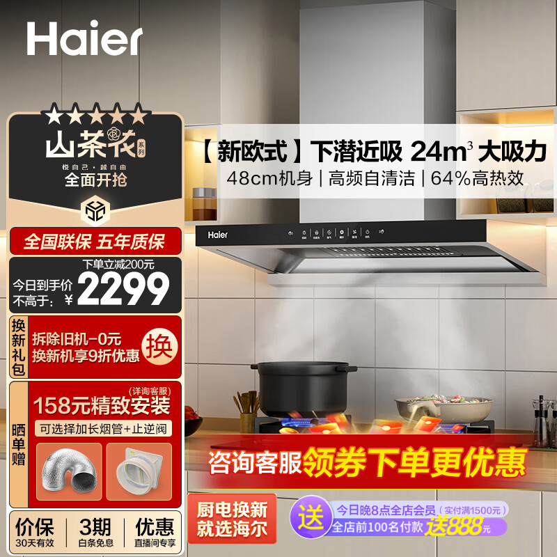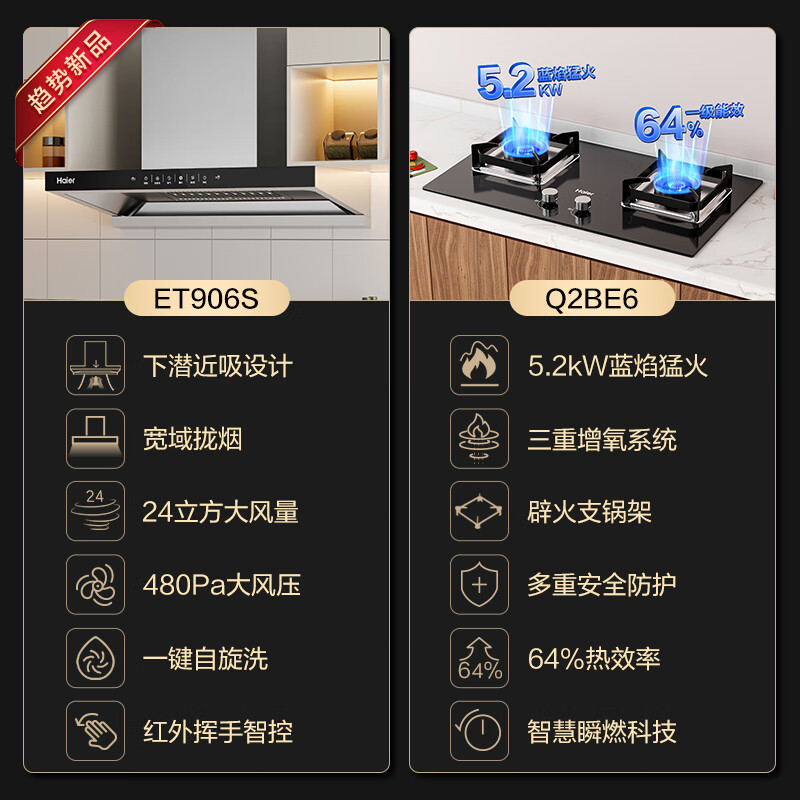 海尔(Haier)抽油烟机 油烟机燃气灶套装【山茶花】深潜近吸24大吸力 5.2kw火力64%热效 以旧换新ET906S+BE6天价格:2554.00元!