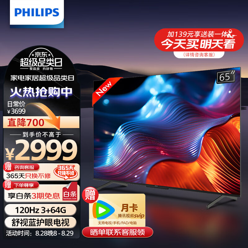 飞利浦(PHILIPS)65英寸4K超高清护眼高刷屏 家用客厅大屏影音 智能投屏液晶平板电视机65PUF8099/T3价格:2999.00元!