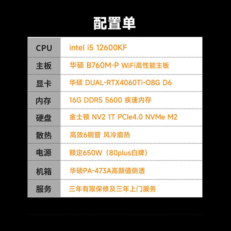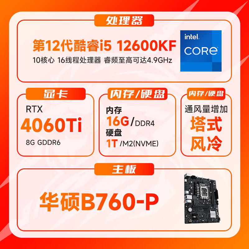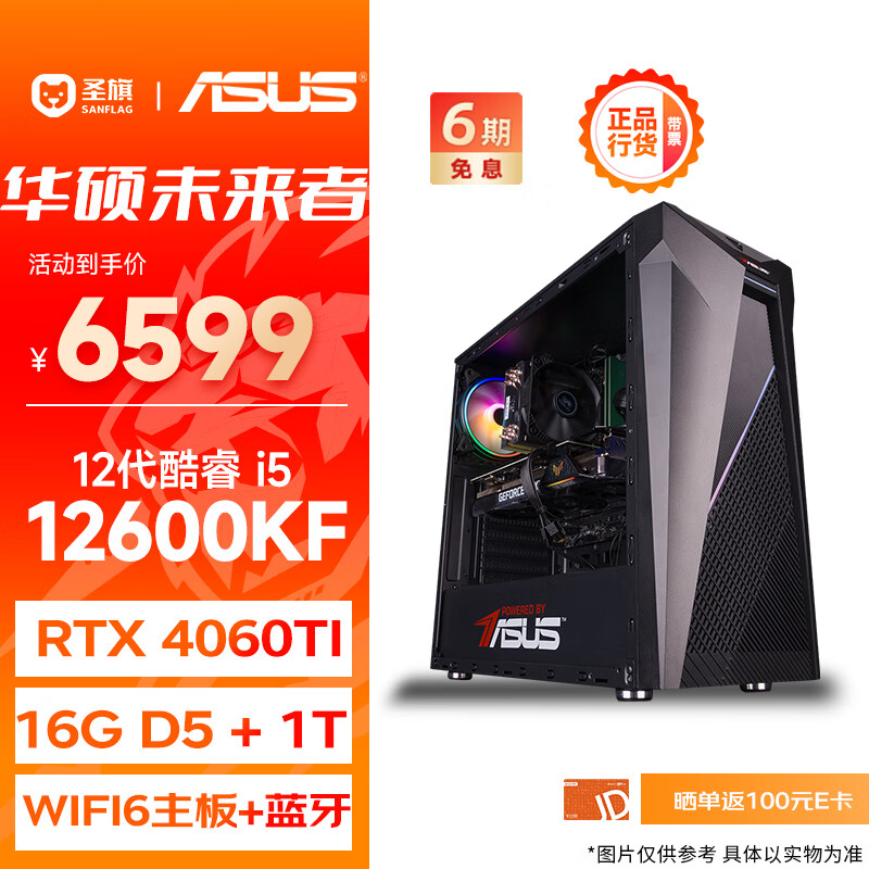 圣旗华硕(ASUS)i5 12600KF/RTX4060Ti/16G D5/1T黑神话悟空电竞游戏设计师台式电脑主机diy组装整机价格:7899.00元!