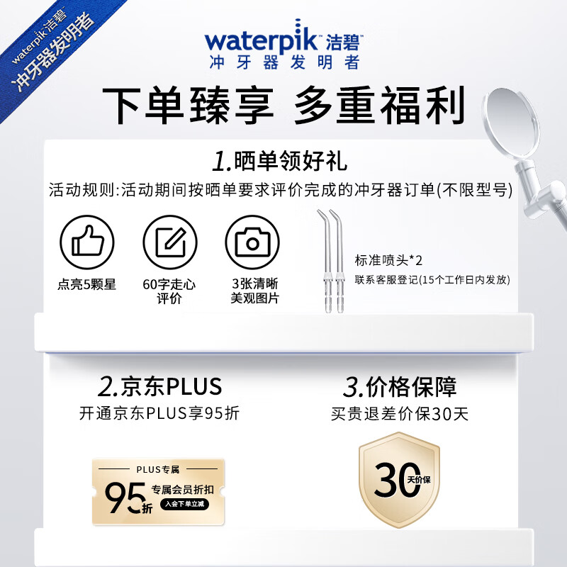1、十年前买的同牌子冲牙器已经老态龙钟了,嫌弃它就入了个全新的,价格相比之前的直接翻倍。还送了不少东西,这牌子过硬,所以回购了。
