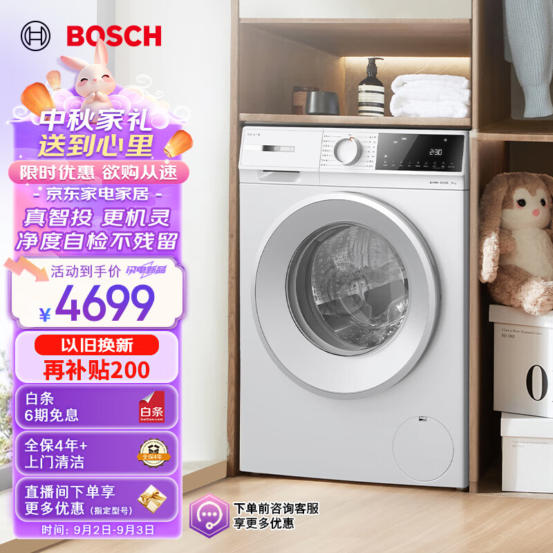 博世【云朵白】家用滚筒洗衣机全自动10公斤大容量变频 智能投放 除菌除螨 快洗 XQG100-WGE252A0AW价格:4699.00元!