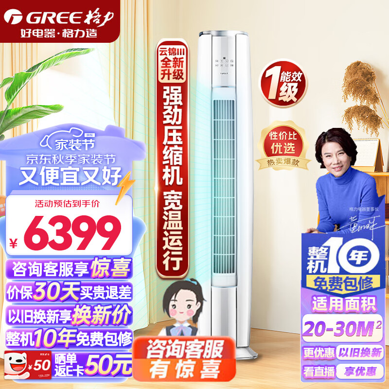 格力(GREE)空调立式 2匹 云锦三代新一级能效变频自清洁智能客厅圆柱空调立式柜机KFR-50LW/NhBa1BAj价格:6399.00元!