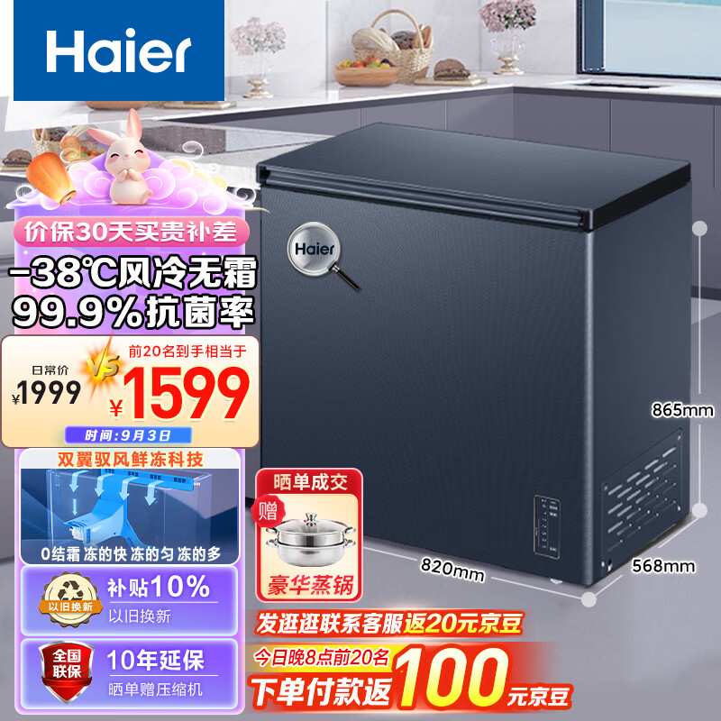 海尔(Haier)159升风冷无霜冰柜家用商用一级能效省电保鲜全冷冻卧式冷柜BC/BD-159WGHED以旧换新价格:1699.00元!