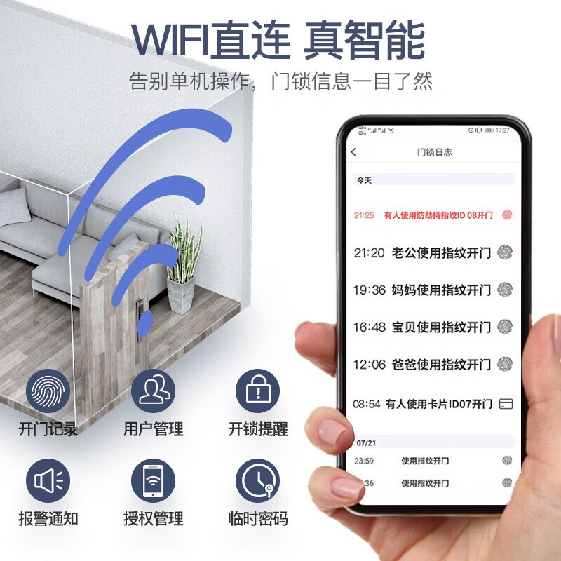 附加功能:静音模式,防试开报警,防撬报警,防劫持报警,防盗模式,电池更换提醒