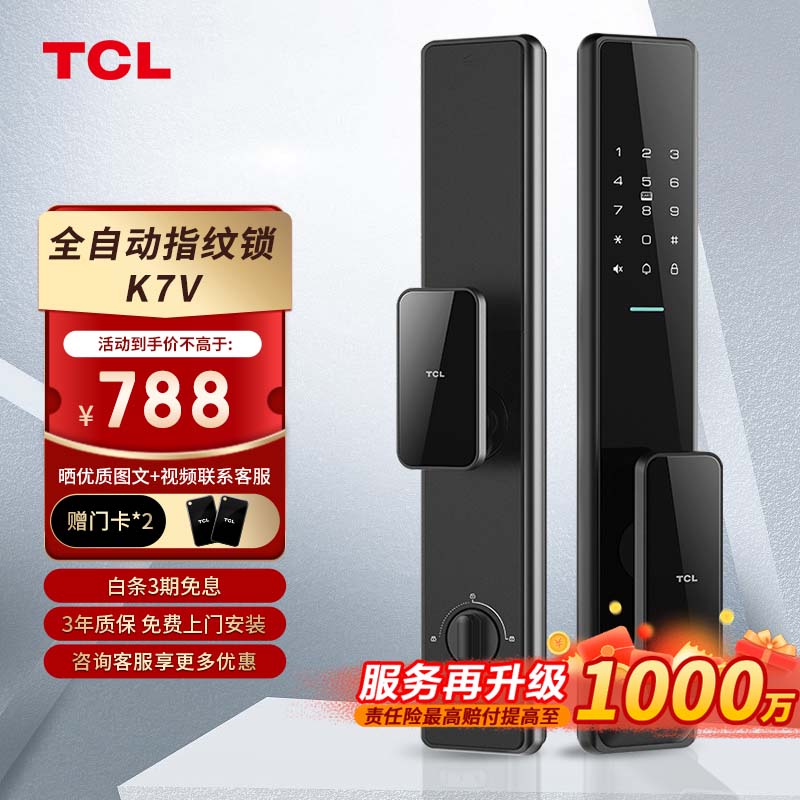 TCL电子锁指纹锁智能门锁家用防盗锁密码锁推拉式全自动款 K7V 门铃联动+全自动开锁价格:788.00元!