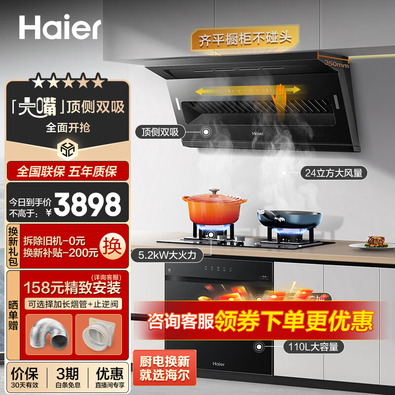 海尔(Haier)抽油烟机 顶侧双吸油烟机燃气灶消毒柜套装 24m3/min大吸力 110L三抽消毒柜C51+Q2BE3天+EB031价格:3898.00元!