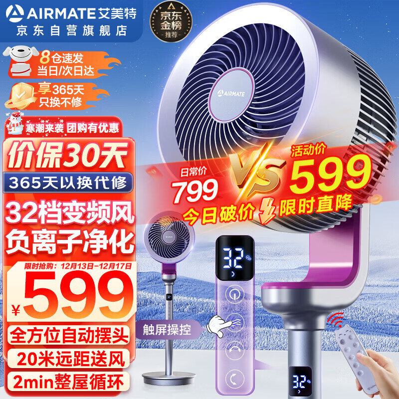 艾美特(AIRMATE) 空气循环扇32档直流变频遥控电风扇家用涡轮换气扇循环对流风扇台桌两用落地扇 FA18-RD70(天鹅负离子净化升级款)价格:799.00元!