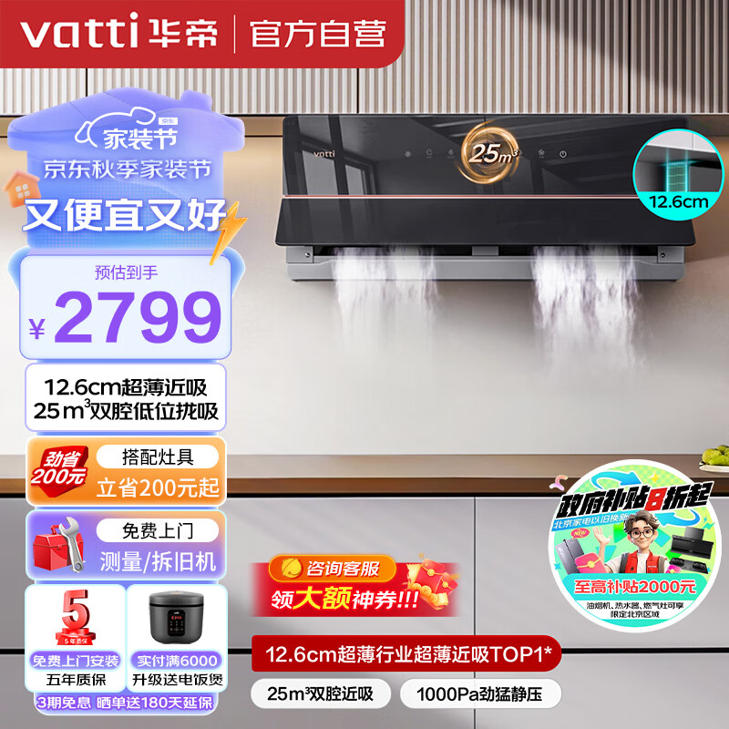 华帝(VATTI)【理想家】官方脱排抽油烟机X6双腔超薄近吸变频25立方大吸力自动清洗以旧换新一级能效 i11210价格:2899.00元!