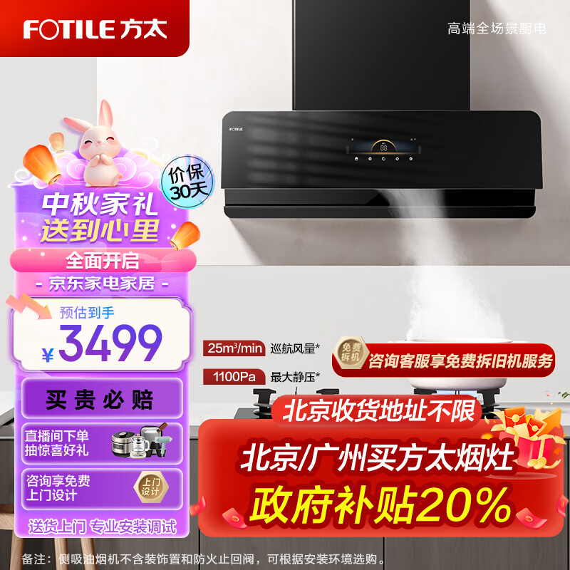 方太(FOTILE)新月抽吸油烟机F1S系列 家用侧吸变频25巡航风量烟灶联动单烟机F1S价格:3499.00元!
