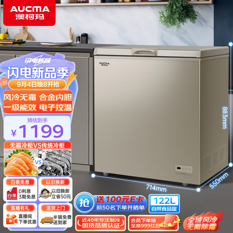 澳柯玛(AUCMA)122升风冷无霜冰柜家用商用单温冷藏柜冷冻柜母乳小冰柜商用小型冷柜冰箱BC/BD-122WD以旧换新价格:1189.00元!