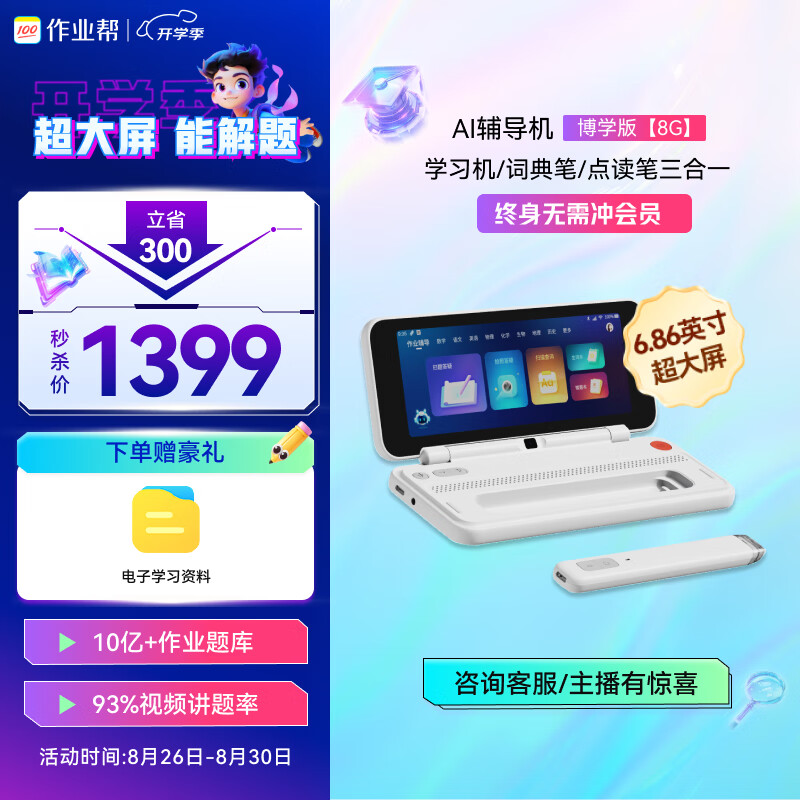 作业帮AI多功能辅导机【博学版】 点读笔学习机词典笔 翻译笔免费视频精讲 10亿+题库6.8英寸护眼屏8GB价格:1399.00元!